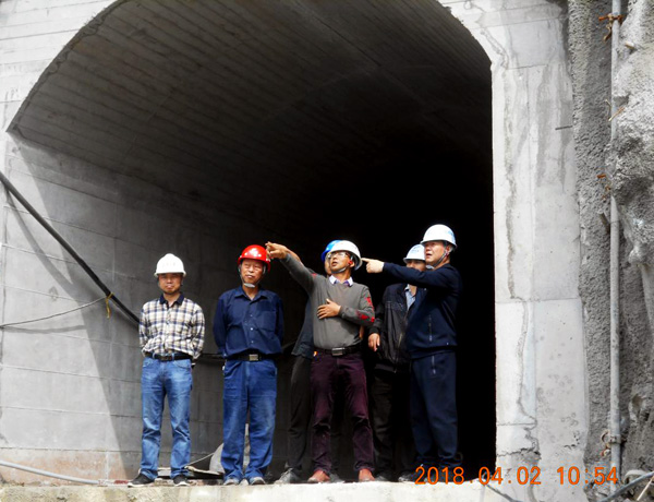 董事長在導(dǎo)流洞出口聽取項(xiàng)目經(jīng)理匯報(bào)工程進(jìn)展情況