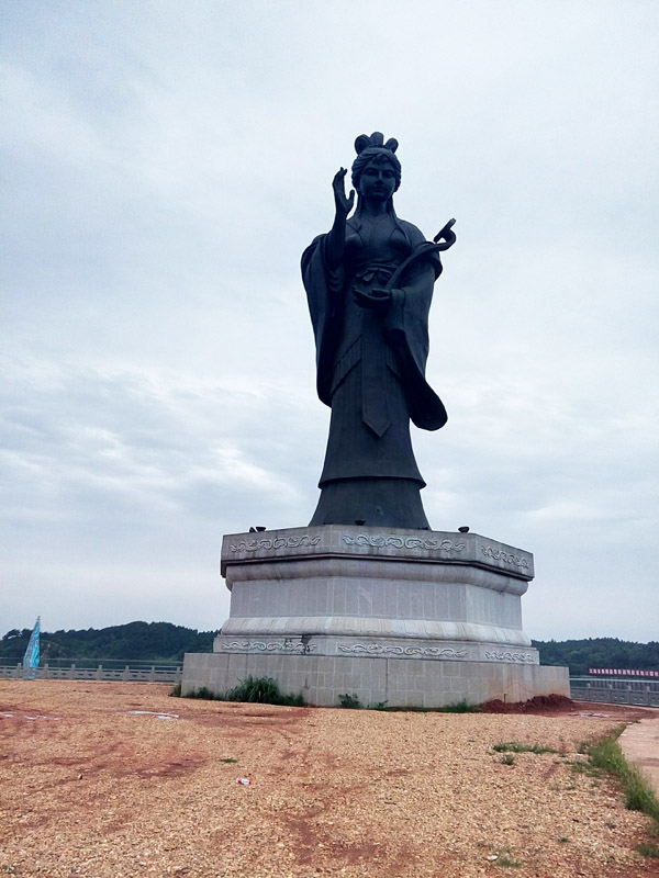 沿著岸邊的鵝卵石小道,我們一路前行至一座仿古的小橋前,橋面由木板鋪就,木板涂滿紅漆,煞是鮮艷惹人。對(duì)比之下,混凝土做成的橋梁則彰顯含蓄,而表面雕琢出類似年輪的紋理,使橋梁更顯內(nèi)斂深沉,又不覺突兀。小橋兩側(cè)的欄桿由木條構(gòu)成,上面卻是橙黃的漆面,雕有花草鳥石,十分精細(xì)。走過木橋,再行穿廊過巷,出現(xiàn)在眼前的便是一座近30米高的古代女子雕像,雕像呈深灰色,坐落于八棱型花崗巖底座上。女子鵝蛋臉型,梳著唐朝云髻,頭頂六瓣花飾,身著寬袖宮裝,右手豎起手印,左手平托一如意,背朝鄱陽湖,臉朝對(duì)面的斗笠山。走近細(xì)看,底座上有漢白玉板,上面書寫了女子姓名與生平,這是著名的“饒娥像”。